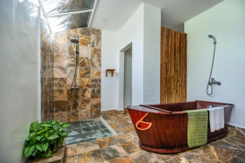 All rooms and bungalows come with air conditioning, as well as a terrace with views of the garden and river. Mosquito nets are provided. En suite bathrooms come with a bathtub and free toiletries.
