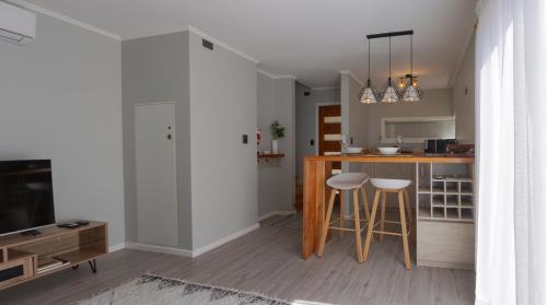 这家空调公寓配有1间卧室、起居室、带冰箱和咖啡机的设施齐全的厨房以及1间带淋浴设施和免费洗浴用品的浴室。1间浴室配有浴缸,也配备吹风机,提供毛巾和床上用品。