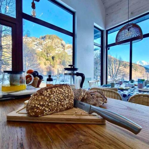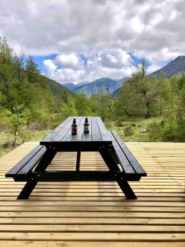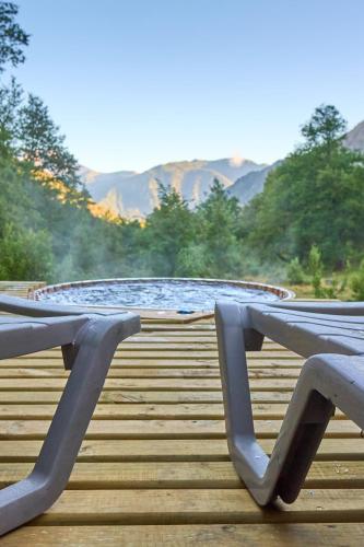 这家小木屋提供露台,享有山景,拥有3间卧室、起居室、平板电视、带冰箱和洗碗机的设施齐全的厨房以及2间带淋浴设施的浴室。2间浴室配有热水浴池,也配备免费洗浴用品,提供毛巾和床上用品。
