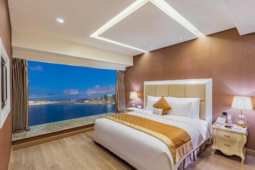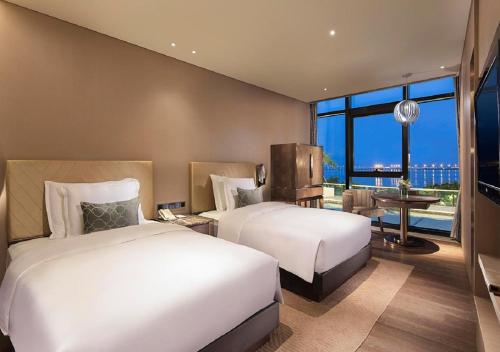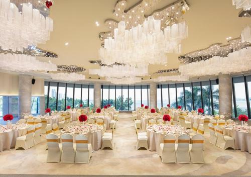 珠海海湾大酒店面朝蓝色的大海,提供带将军山或南海景致的现代化奢华住宿、餐饮场所、室外游泳池和免费Wi-Fi。