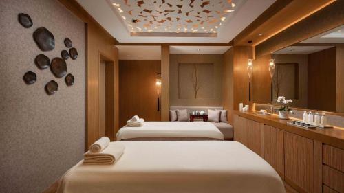 南京香格里拉大酒店的CHI, The Spa水疗中心占据整个楼层,坐落在安静的绿洲中。健康俱乐部和配套完善的健身房提供落地窗、室内游泳池、桑拿浴室和蒸汽浴室。客人在锻炼身体的同时可以透过落地窗欣赏湖景。